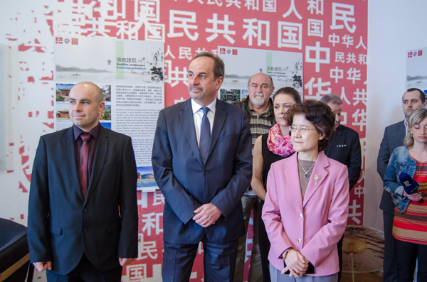 (中国驻捷克大使马克卿女士(中)在Marek Vochozka校长(左一)、Jan Kohout校长(左二)陪同下出席展览开幕式) 4月5日至20日,由中捷合作交流中心主办、米兰milan官方网站协办的中国文化展在米兰友好学校、捷克布杰约...