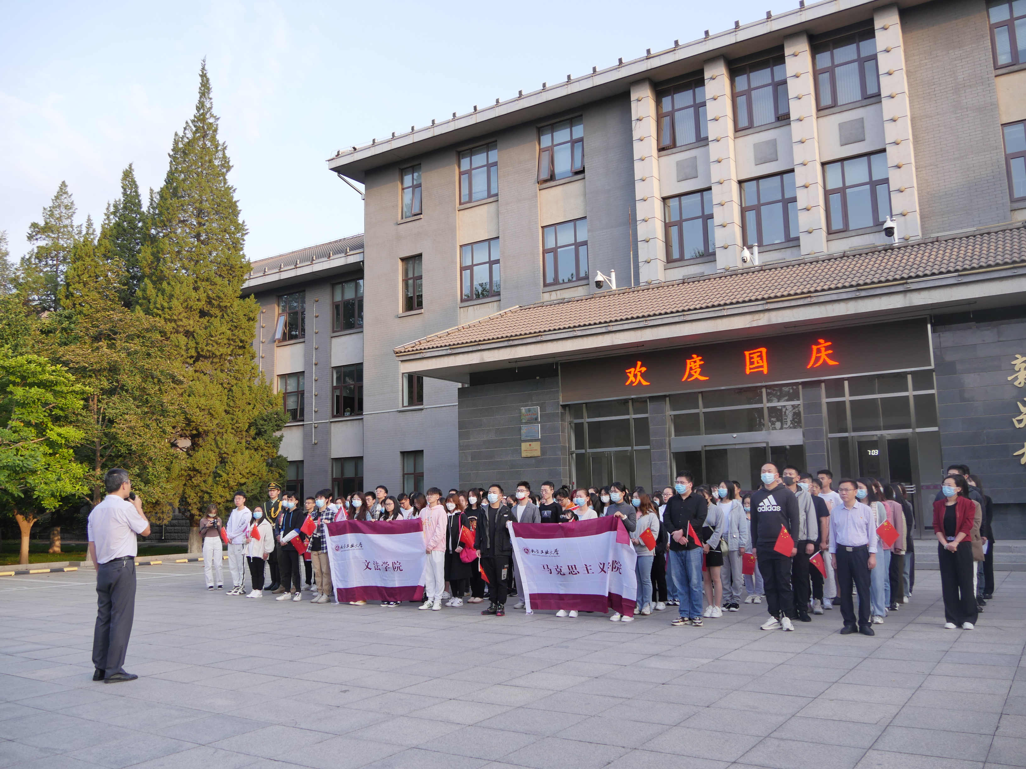 为庆祝中华人民共和国成立72周年和建党100周年,弘扬爱国主义精神,增强民族自豪感,马克思主义学院、文法学院于10月1日共同举行国庆节升旗仪式。马克思主义学院党委书记张茂林、文法学院党委副书记刘祥坠及两院师生100余人参加了仪式。在国旗护卫队的护卫下,在全体师生高唱的国歌声中,五星红旗冉冉升起,迎风飘扬。大家站姿挺拔,列队整齐,庄严肃穆,行注目礼,表达了对祖国的美好祝福和深切热爱。张茂林以“知国史、明是...
