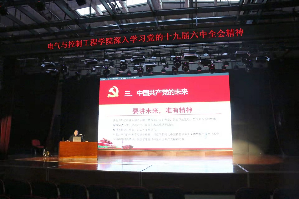 11月25日下午,电气与控制工程学院党委在学生综合服务楼多功能厅召开了学院党员大会,专题学习党的十九届六中全会精神。大会特邀米兰党的十九届六中全会精神师生宣讲团成员、马克思主义学院周守高老师作宣讲报告,学院党委委员、全体师生党员共计300余人参加了大会,学院党委书记李颖宏主持报告会。周守高老师从时空两个维度、四个方面结合中国共产党党史深入解读了党的十九届六中全会做出的大会决议报告。首先以“三个历史决议”为引,...