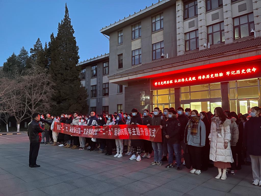 冬日里的北京,晨光熹微。为纪念“一二.九”爱国运动86周年,进一步弘扬爱国主义精神,引导青年学子树立正确的历史观、民族观,以锐意进取的姿态承担起青年一代的责任,日前,文法学院举行“铭记一二•九,奋进新征程”主题升旗仪式。2021年新发展的党员、积极分子等200余人齐聚升旗台前,共同见证庄严时刻。清晨7时许,国旗班迈着坚定的步伐,准时从敦品楼东侧出发,庄严地护送五星红旗至国旗台下。伴随着铿锵激昂的《义勇军进...
