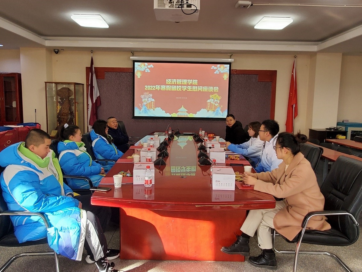 1月31日上午,在除夕之日经济管理学院在励学楼201会议室举行2022年寒假留校学生慰问活动,学院院长赵继新、党委书记王伟宾、党委副书记赵洁及留校学生参加了慰问活动。活动中,与会同学有的分享了自己的冬奥志愿服务经历,表达了能够参与到国家重大活动的喜悦之情;有的介绍了家乡的传统习俗,描绘了留校同学一起装点宿舍的经过;还有的同学表示,这是自己在外度过的第一个春节,对家乡的思念、父母的思念情不自禁。活动中,学...