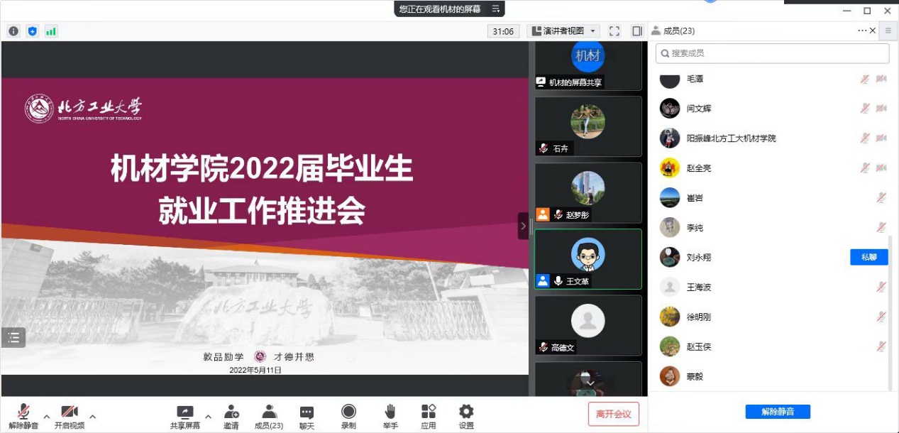 5月11日晚,机械与材料工程学院召开2022届毕业生就业工作推进会,学院全体班子成员、各系主任、班导师、本科就业辅导员参加会议。学院2022届辅导员赵梦彤汇报了2022届学生的就业情况。春季学期以来,在年级辅导员、班导师共同努力下,学院就业工作得到有效推进。随着5月初材料18级汪鹏同学被复旦大学材料与化工专业录取,学院本科学生考研、调剂指导工作圆满结束,学院众多学子考取了心仪的学校、专业,实现升学深造的人生梦想...