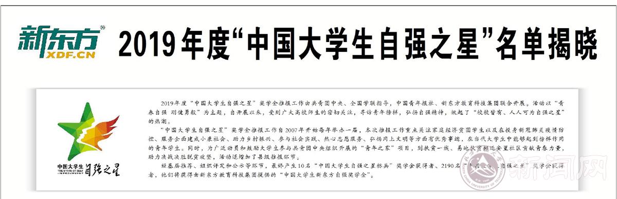 2019年度“中国大学生自强之星”奖学金推报工作由共青团中央、全国学联指导,中国青年报社、新东方教育科技集团联合开展。活动以“青春自强 刚健勇毅”为主题,自开展以来,受到广大高校师生的密切关注,寻访青年榜样,弘扬自强精神,掀起了“校校皆有、人人可为自强之星”的热潮。
