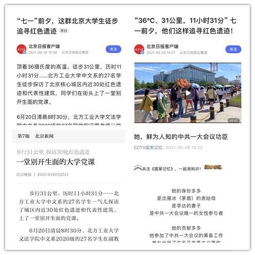 2021年暑假,由文法学院中文系冯雷副教授担任指导教师的大学生暑期社会实践团,以北京红色遗迹和城市地标建筑等为研究考察对象,通过徒步寻访、开展沉浸式社会实践活动,为学生上了一堂 “行走的思政课”。2021年6月,实践团以考察北京城内重要的红色遗迹为主,将民族文化宫作为起点,途经李大钊故居、国立女子师范大学旧址、聂耳故居、鲁迅故居、京报馆旧址、李大钊被捕地等30余处红色遗迹,历时11小时30分钟,全程逾31公里。7月,实践团以“北京十大建筑”为考察重点,从北京城市地标建筑的变化切入“四史”学习,实地参观代表性建筑。从城市地标的建筑风格、建筑成就、施工工艺、社会影响等方面,讨论古都北京的历史巨变,深化对党史、新中国史、改革开放史和社会主义发展史的学习和认识。实践活动受到北京日报、北京晚报等主流媒体的关注报道。实践团学生撰写的相关党史学习教育文章在“CCTV国家记忆”微信公众号发表,累计阅读量达6万多人次。学生受踏访启发开展的相关学术研究,被新华社报导,累计阅读量超过50多万人次,相关成果在中国作协主办的《文艺报》发表。
