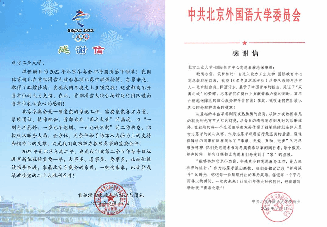 感谢信对米兰服务保障团队在冬奥闭环期间的工作予以高度评价。首钢滑雪大跳台场馆运行团队表示,学校站在“国之大者”的高度,全方位、无条件给与场馆志愿者鼎力支持和精神支撑,为首钢滑雪大跳台成功举办各项赛事发挥了积极作用,做出了重要贡献。