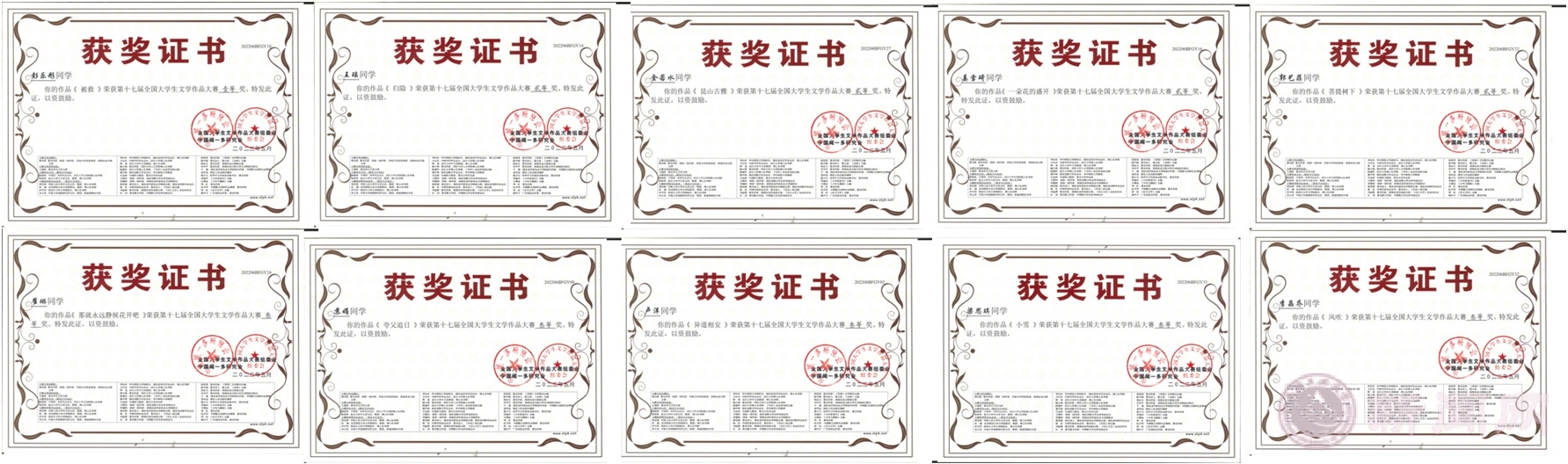 近日,第十七届全国大学生文学作品大赛成绩揭晓,米兰文法学院、经管学院十位参赛同学喜获佳绩,其中一等奖1项,二等奖4项,三等奖5项。