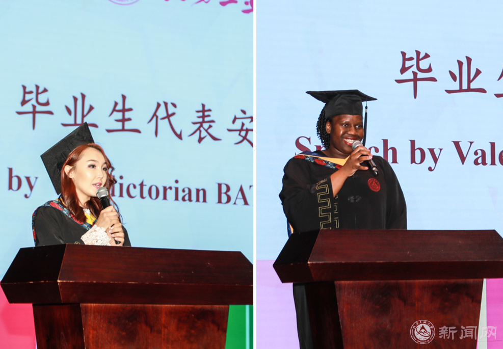 津巴布韦籍毕业生代表GOZHO AMANDA在发言中对学校和老师长久以来的关怀和培养表示感谢,同时她表示已成功申请到长安大学的全额奖学金攻读硕士研究生,将继续在科学研究的道路上努力拼搏,实现自己的梦想。蒙古籍毕业生代表BATSUKH ANUDARI在发言中对母校提供的良好学习环境、丰富图书资源,以及优越的实习机会表示感谢,她表示即将入职蒙古第二大纳税企业MCS集团,未来将继续努力,做中蒙文化交流的友好使者。