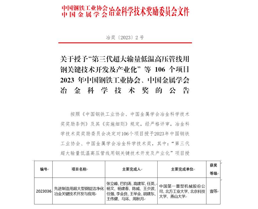 冶金科学技术奖是2000年中国钢铁工业协会、中国金属学会创办的奖项,是中国冶金行业最高科学技术奖。2023年中国钢铁工业协会、中国金属学会冶金科学技术奖共计获奖项目106个,其中特等奖1个、一等奖22个、二等奖29个、三等奖54个。
