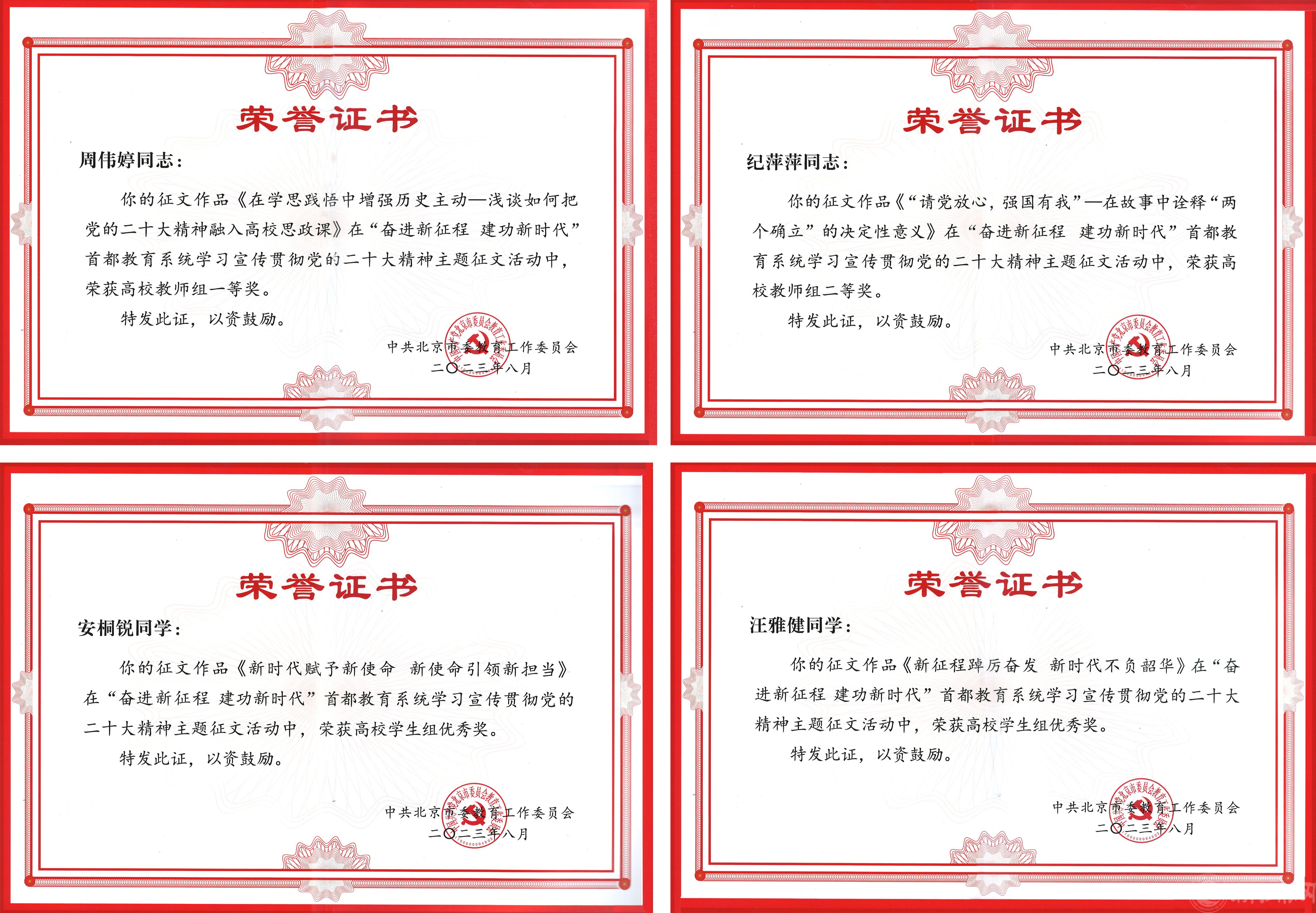 近日,由北京市委教育工委、北京市教育委员组织开展的“奋进新征程 建功新时代”主题征文活动获奖名单公布。米兰马克思主义周伟婷、纪萍萍分获高校教师组一、二等奖,文法学院安桐锐、伦敦布鲁内尔学院汪雅健获高校学生组优秀奖。