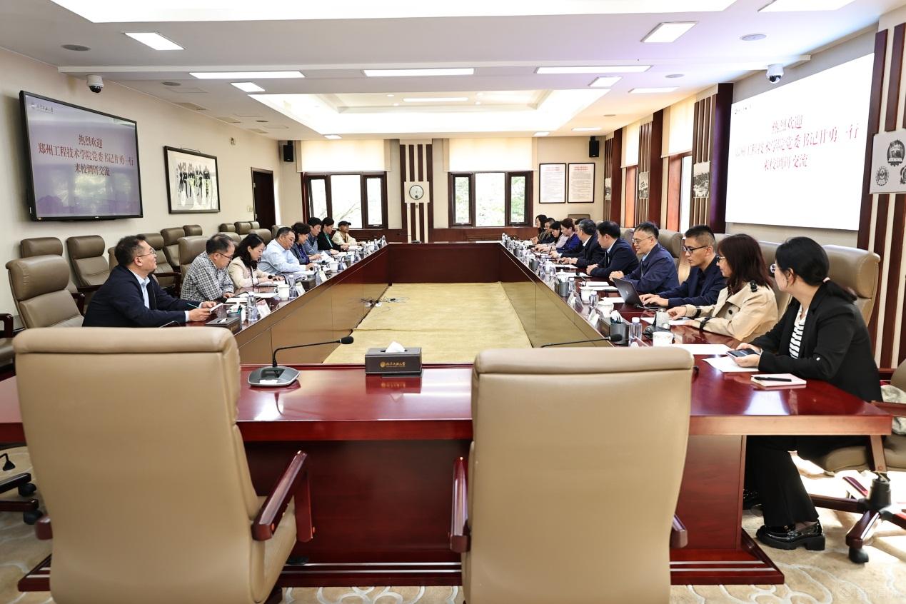 10月8日,郑州工程技术学院党委书记甘勇一行来校调研交流,校党委书记刘军,党委常委、副校长栗苹在敦品楼302会议室接待来宾,进行了座谈交流。座谈会由栗苹主持。