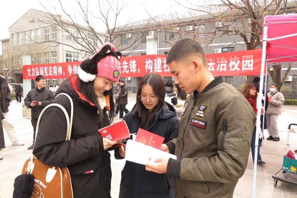 12月4日中午,学校在毓秀广场组织开展“大力弘扬宪法精神,建设社会主义法治文化”宪法宣传活动。宪法宣传“小先锋”们向来往师生共计发放了200余册宪法读本等宣传材料,为同学们解答宪法相关问题,营造浓厚的宪法学习氛围。同学们学习热情满满,活动现场气氛热烈。