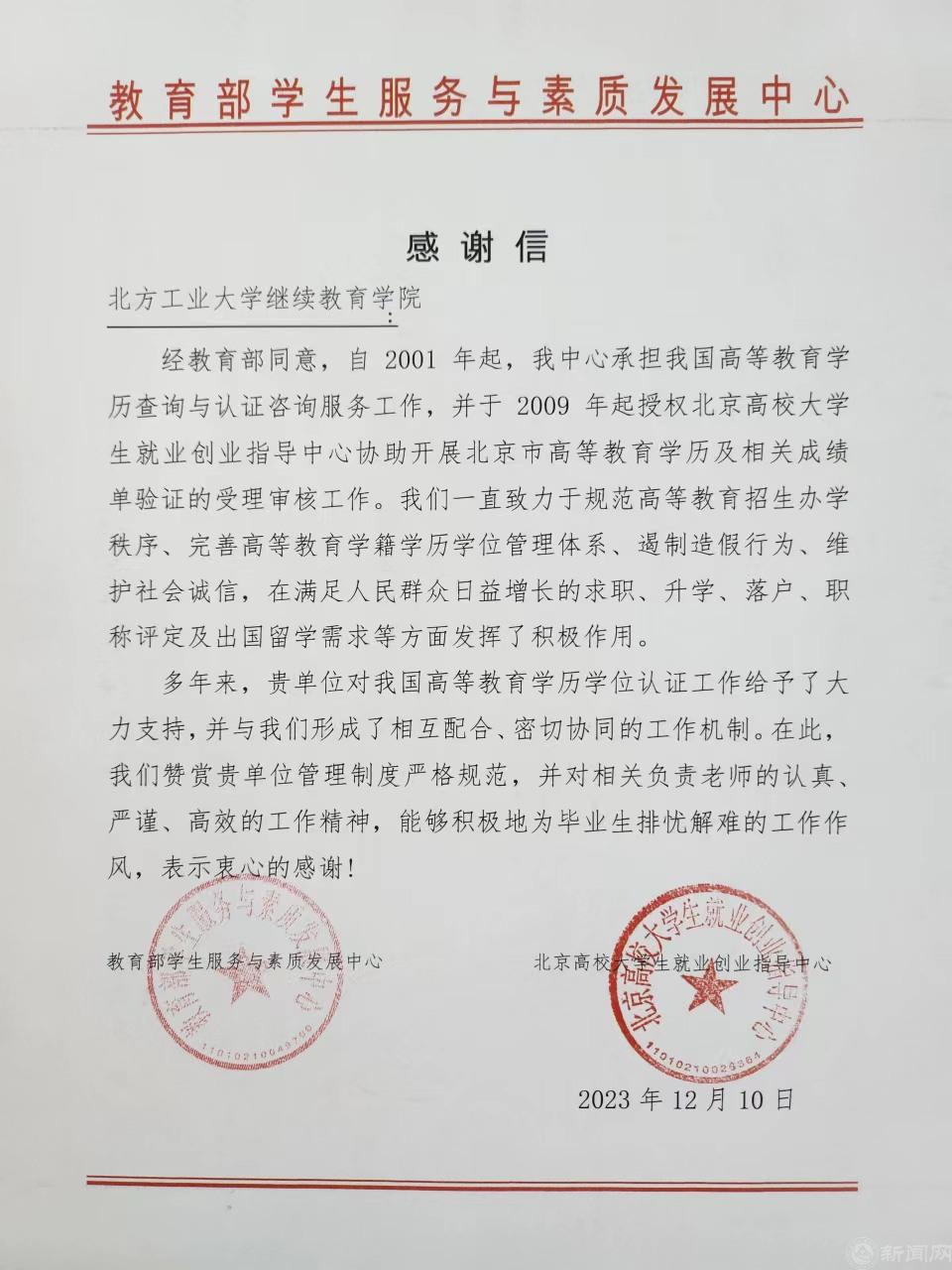 近日,米兰继续教育学院收到教育部学生服务与素质发展中心与北京高校大学生就业创业指导中心联合发来的感谢信。信中对米兰继续教育学院在学历学位认证方面的工作给予的充分肯定,对学院管理制度严格规范、负责老师认真严谨高效的工作精神、为毕业生排忧解难的工作作风表示衷心感谢。