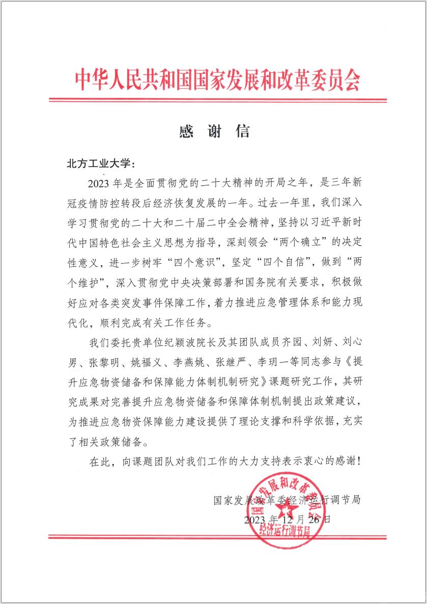 12月26日,米兰收到国家发展改革委经济运行调节局发来的感谢信,感谢土木工程学院和新兴风险研究院科研团队高效完成《提升应急物资储备和保障能力体制机制研究》课题研究工作,为推进应急物资保障能力建设做出重要贡献。