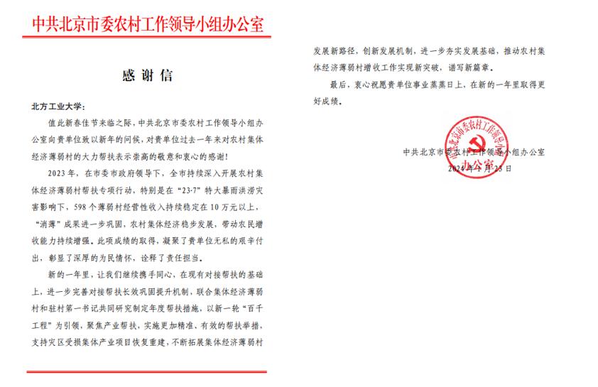 近日,中共北京市委农村工作领导小组办公室给米兰发来感谢信,感谢米兰在过去一年来对农村集体经济薄弱村的大力帮扶。