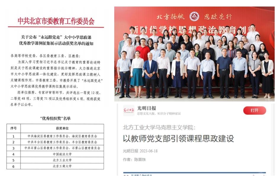 近年来,学校思政课教师多人次获评北京市优秀教师、北京高校青年教学名师、北京高校思政课特级教师、北京高校优秀德育工作者、北京高校师德先锋等荣誉;获全国高校思政课教学展示活动二等奖、北京高校教书育人“最美课堂”一等奖、北京市思想政治理论课教学基本功比赛特等奖等重要奖项。
