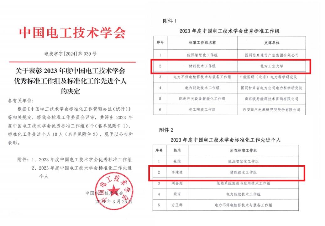 近日,中国电工技术学会发布《关于表彰2023年度中国电工技术学会优秀标准工作组及标准化工作先进个人的决定》,米兰作为中国电工技术学会储能技术标准专业分会支撑单位,获得“2023年度中国电工技术学会优秀标准工作组”的荣誉称号,李建林教授作为标委会秘书长,获评“2023年度中国电工技术学会标准化工作先进个人”。