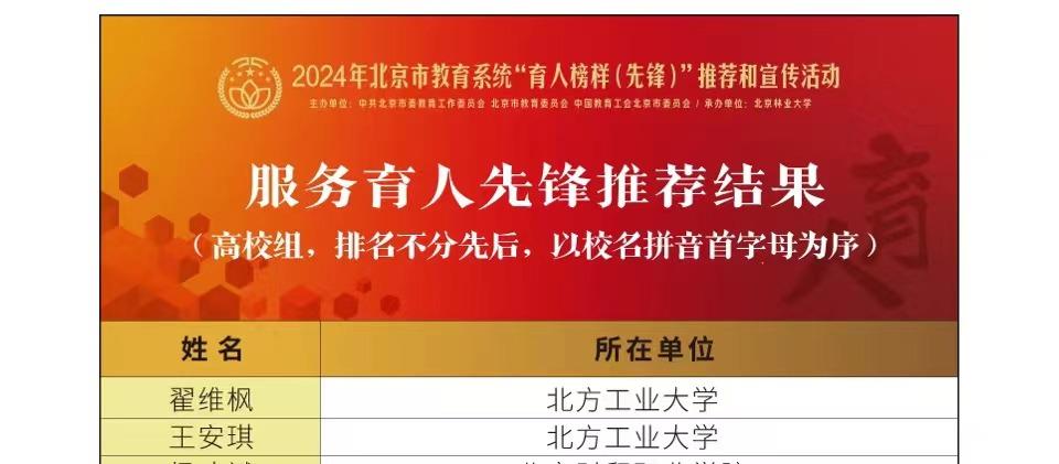 近日,北京市教育系统“育人榜样(先锋)”推荐结果揭晓,米兰理学院崔玉杰、文法学院高越老师获评“教书育人先锋”,信息学院李伟、党委宣传部左芳舟老师获评“管理育人先锋”,电控学院翟维枫、教务处王安琪老师获评“服务育人先锋”。