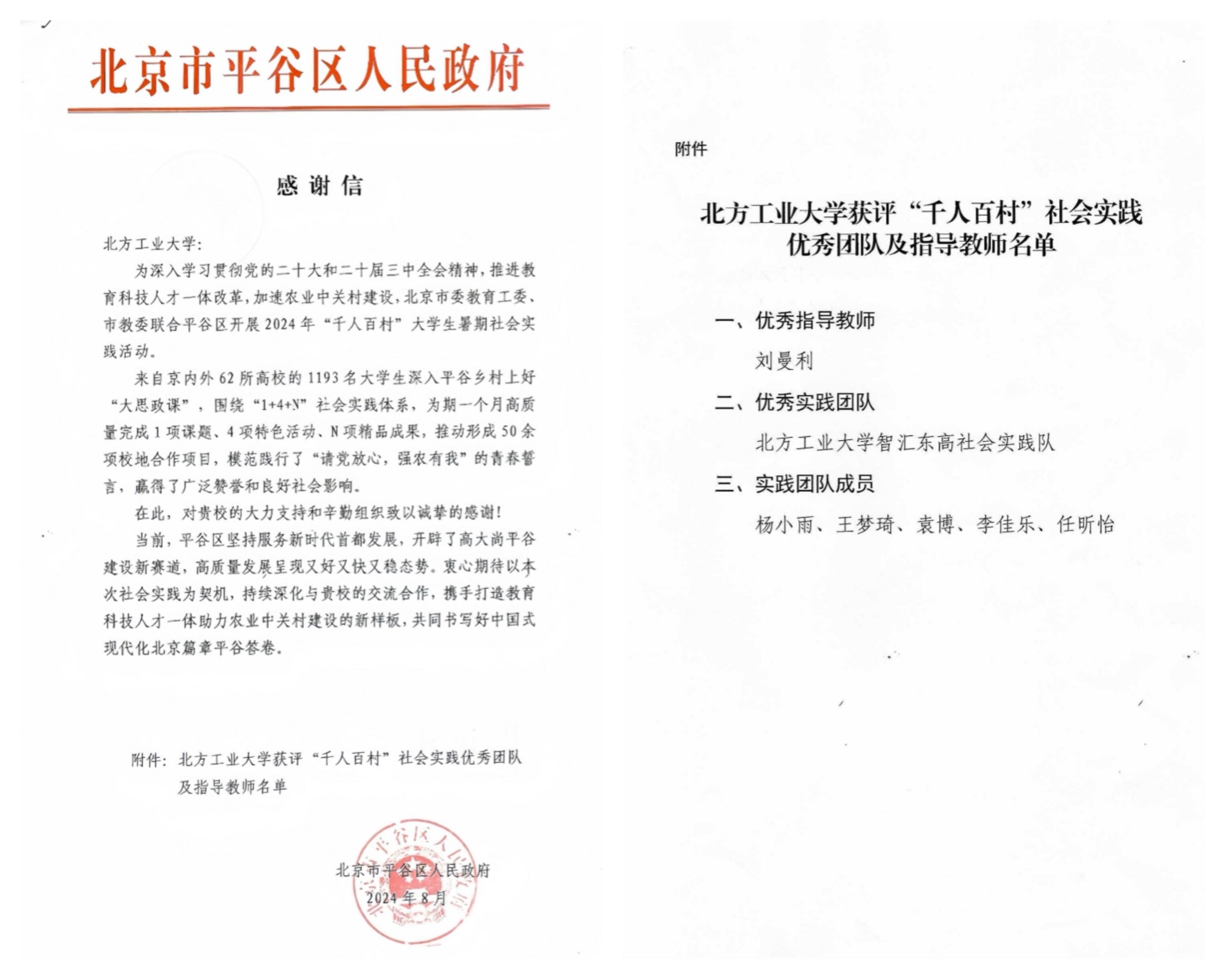 日前,米兰文法学院智汇东高社会实践团在首都高校2024年“千人百村”大学生社会实践活动中获评“优秀实践团队”,指导教师刘曼利获评“优秀指导教师”。北京市平谷区人民政府、北京市平谷区东高村镇大庄户村村民委员会对实践团致函感谢。