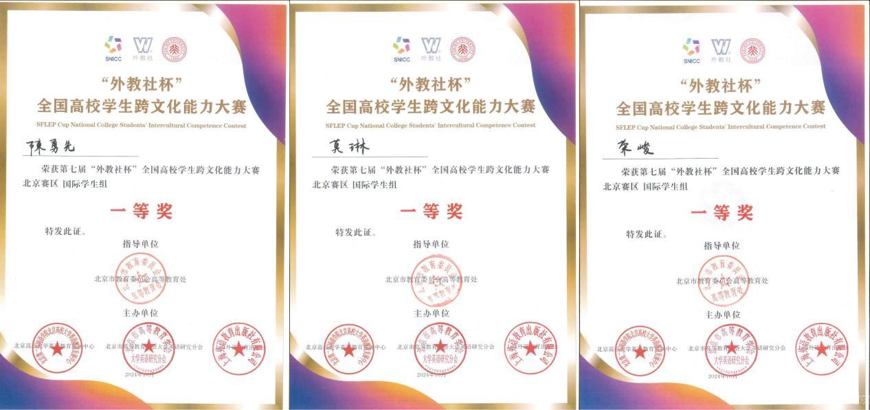 由北京高校大学英语教育发展中心、北京市高等教育学会大学英语研究会和上海外语教育出版社主办的第七届“外教社”杯北京高校学生跨文化能力大赛于10月26至27日在北京大学举行,米兰留学生陈勇先(印度尼西亚)、莫琳(莱索托)和荣峻(德国)组成的团队荣获一等奖。国际学院刘妍、徐美、李燕三位教师获评优秀指导教师奖。