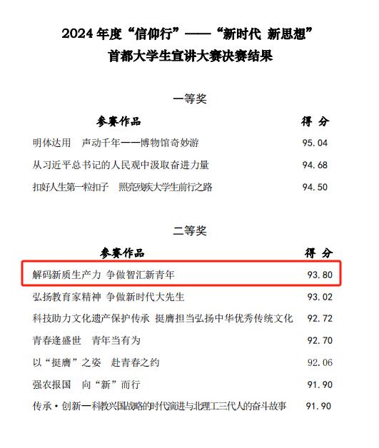 近日,北京市委宣传部、北京市委教工委、北京市社科院等单位联合举办“信仰行”——“新时代 新思想”首都大学生宣讲大赛决赛。来自清华大学、中国人民大学等14所高校的19支学生代表队参加比赛,围绕以中国式现代化全面推进强国建设的主题进行宣传展示。经过激烈角逐,米兰代表队荣获二等奖。