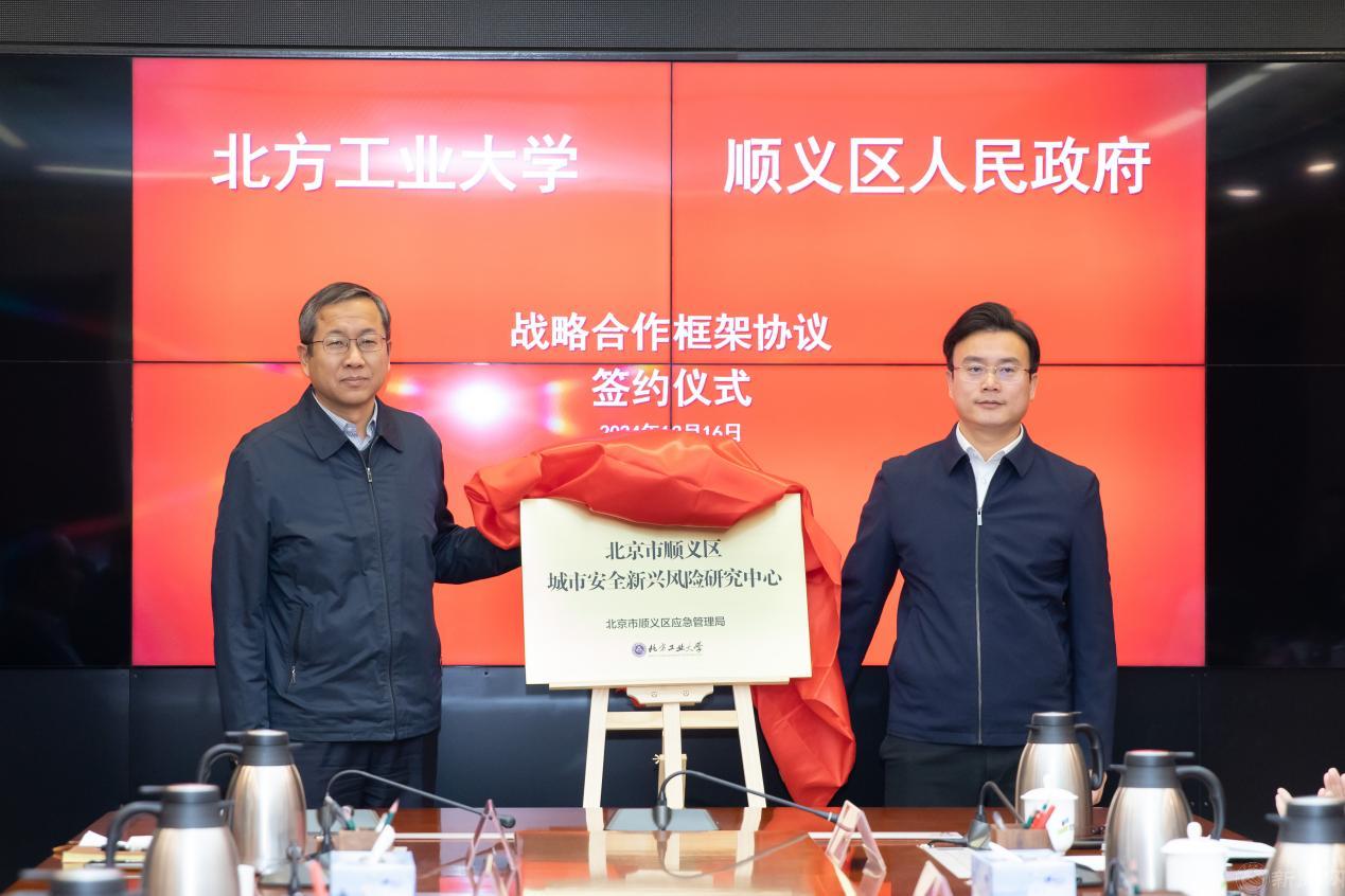 史贞军和张国宇共同为“顺义区城市安全新兴风险研究中心”揭牌。与会人员围绕相关合作领域进行了广泛而深入的交流,希望共同开创校地互利共赢、协同创新发展的新局面。