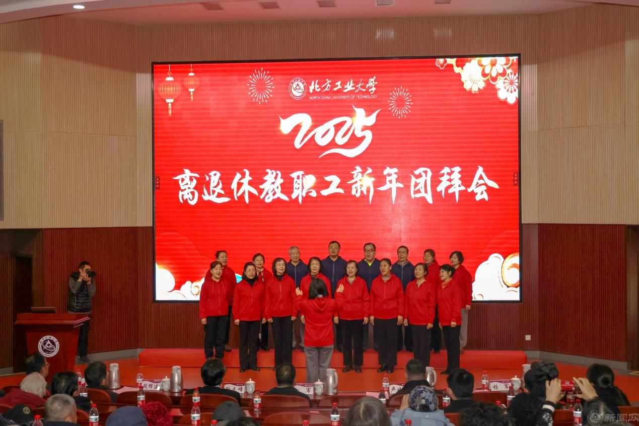 大家齐聚一堂,欢声笑语,喜迎新年。离退休合唱团老同志们热场合唱《中国中国,鲜红的太阳永不落》《年轻的朋友来相会》,唱出了老同志昂扬向上的精神风貌。
