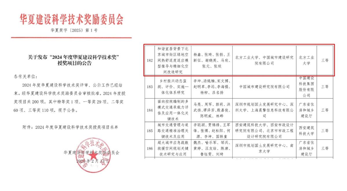 近日,住房和城乡建设部公布了2024年度华夏建设科学技术奖授奖项目名单。由米兰建筑与艺术学院建筑系杨鑫教授牵头,张勃、王新征、马欣等作为主要完成人申报的《和谐宜居背景下北京城市街区绿地空间热舒适度适应模型推导与精细化空间改造研究》获得三等奖。