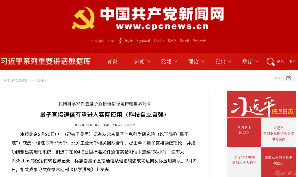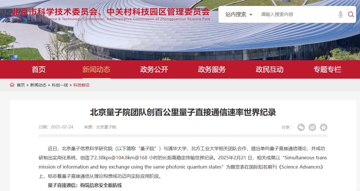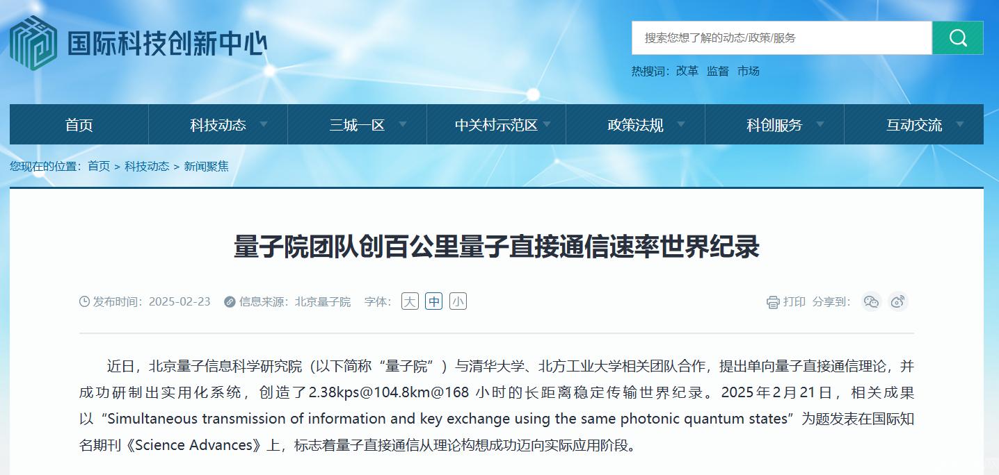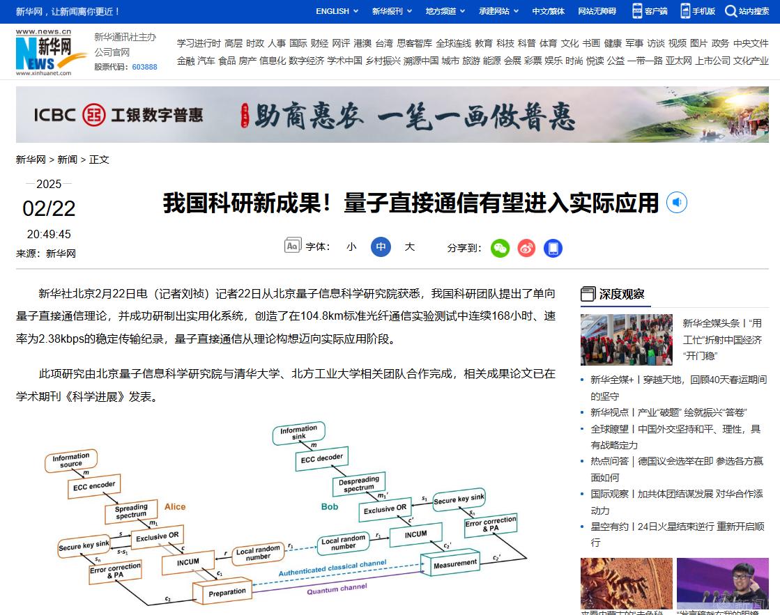 近日,米兰储能学院郑超教授领衔的储能量子直接通信与计算团队作为参研单位,与北京量子信息科学研究院和清华大学相关团队合作,提出单向量子直接通信理论,成功研制出实用化系统,创造了在104.8公里标准光纤通信实验测试中连续168小时、速率为2.38kbps的稳定传输世界纪录。相关成果于2025年2月21日在国际知名学术期刊《Science Advances》(《科学进展》)上发表,这标志着量子直接通信从理论构想成功迈向实际应用阶段。