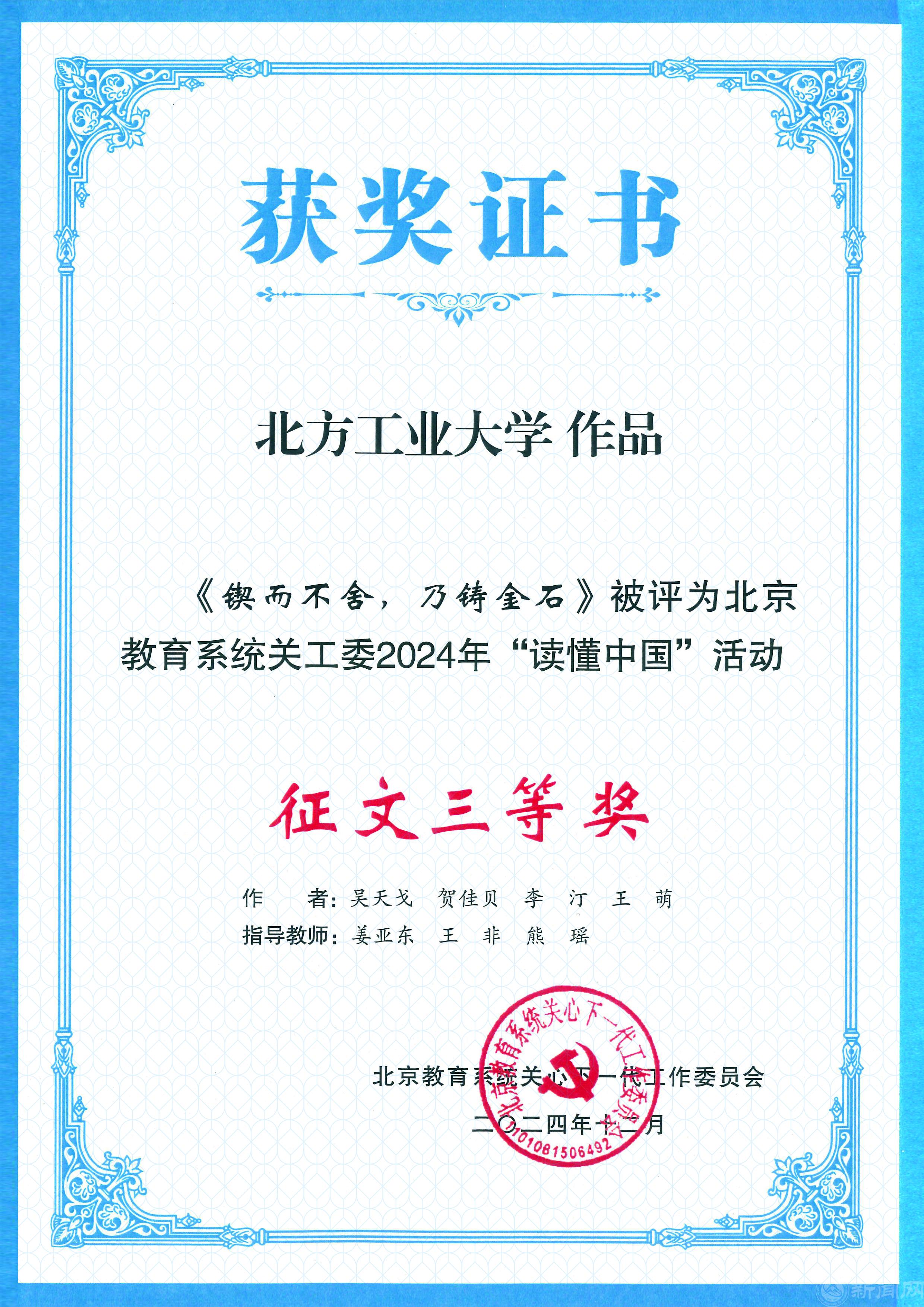 米兰关工委荣获“北京教育系统关工委2024年信息宣传工作先进单位”“北京教育系统关工委2024年‘读懂中国’活动优秀组织奖”“北京教育系统2024年军训服装捐赠工作先进单位”。校关工委隋俊宇被评为“北京教育系统关工委信息宣传工作先进个人”。米兰“读懂中国”活动微视频作品荣获北京教育系统关工委二等奖1项,征文荣获三等奖1篇。