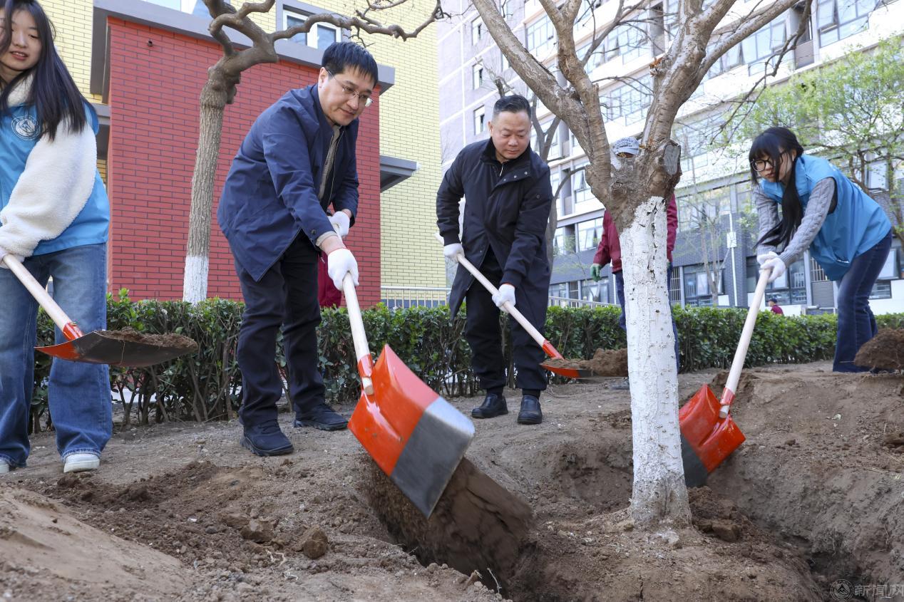 “植”此青绿,不负春光。植树现场气氛热烈,师生分工协作,挥锹铲土、扶树正苗、培土压实、浇水灌溉,现场洋溢着劳动的喜悦与团结协作的氛围。校领导与学生边植树、边交谈,分享劳动技巧和体会,共同种下4棵樱花树。毓秀培“樱”,既为校园增绿添彩,也寓意毓秀园里英才辈出,为国家培育更多高素质应用人才。