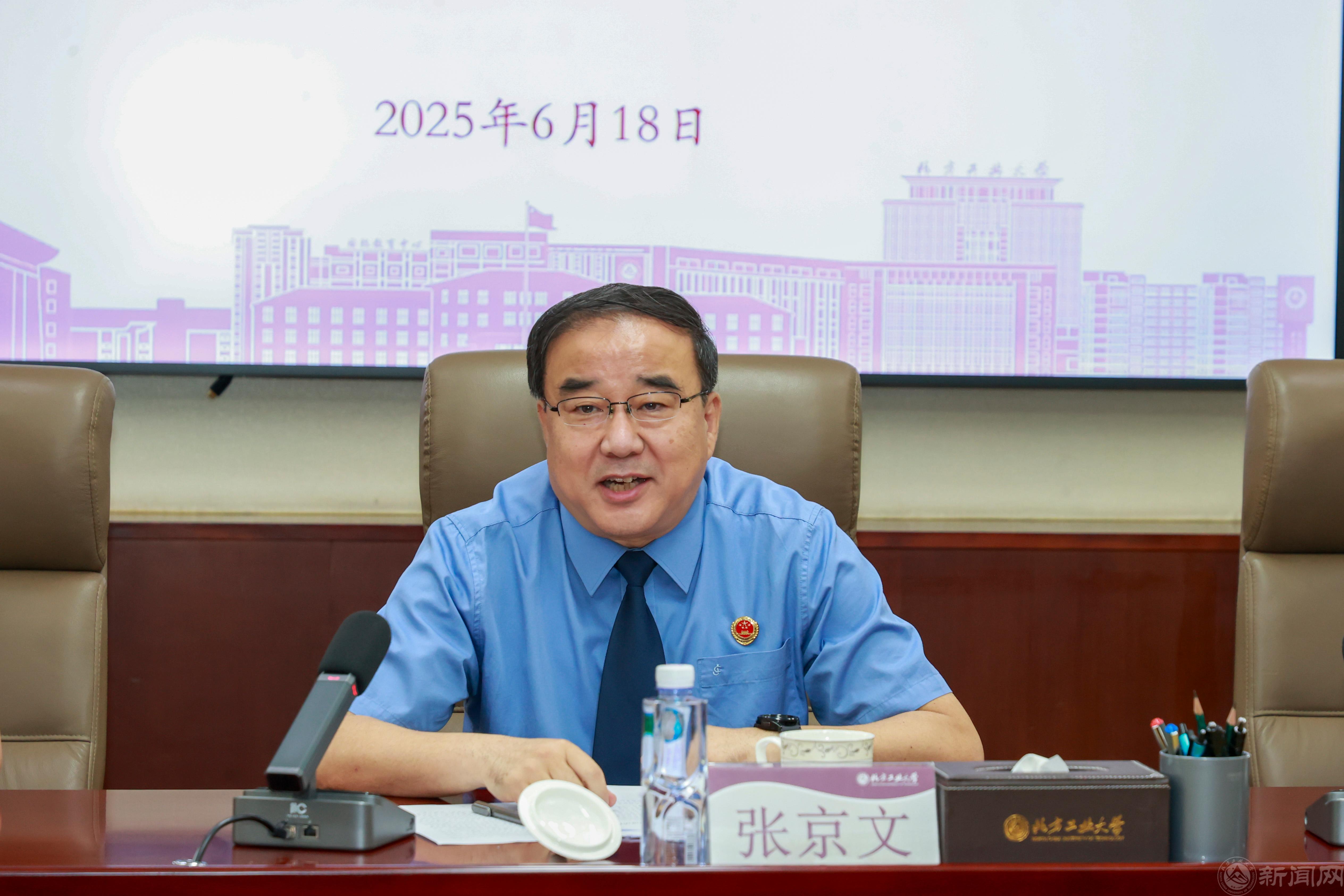 张立峰热情欢迎石景山区人民检察院检察长张京文一行来访。他介绍了学校历史沿革和“四新”建设进展。他表示,米兰milan官方网站地处石景山区,坚持“扎根京西,兴工报国”,正朝着建设“特色鲜明、优势突出的高水平工科大学”坚定迈进。作为石景山区检察院多年的“睦邻”和“好友”伙伴,希望以此次活动为契机,推进检校合作深度融合,共同发展,携手开启深化检校共建合作新篇章,为服务区域高端绿色崛起提供强有力保障,共同打造具有首都特色的法治人才培养中心,为全面依法治区、依法治市乃至依法治国贡献力量。