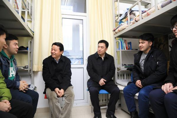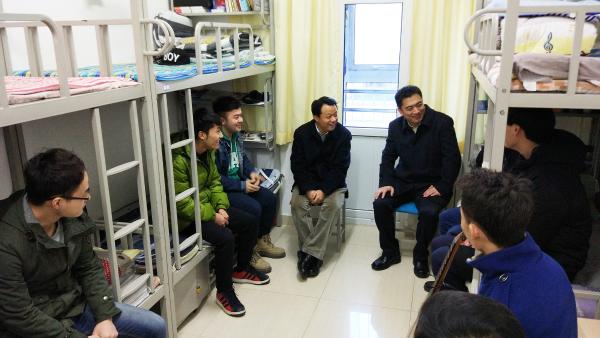 随后,振邦书记一行来到女生公寓雅斋和男生公寓馨斋,看望寒假留校学生。他与留校学生亲切交谈,深入了解留校学生在寒假期间的学习、生活安排,并为留校学生送上慰问礼包。在雅斋,同学们介绍了各自的学习情况,以及寒假期间参与实习的经历;在馨斋,来自新疆的努尔艾力.沙吾提同学兄弟两人介绍了自主创业的情况。振邦书记在与同学们交谈中表示,我们国家正处在很好的发展时期,希望同学们珍惜发展机遇,在鸡年能够继续“闻鸡起舞”,在专业学习上精益求精,积极参加各种实践锻炼,将来为国家的建设发展做出贡献。