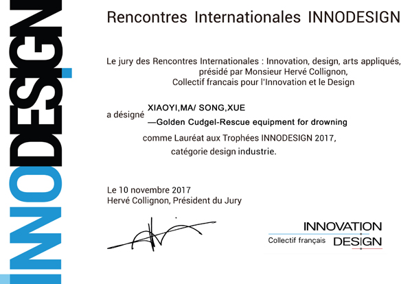 薛松、马晓艺同学在导师刘永翔教授指导和研究生院支持下,认真设计、积极备赛,其参赛作品“Golden Cudgel——Rescue equipment for drowning”注重设计与生态、科技、环保、商业相结合,体现了多元与融合的理念,获得大赛评委良好评价,从1028件各国参赛作品中脱颖而出,荣获2017 年度法国INNODESIGN PRIZE国际创新设计大奖。