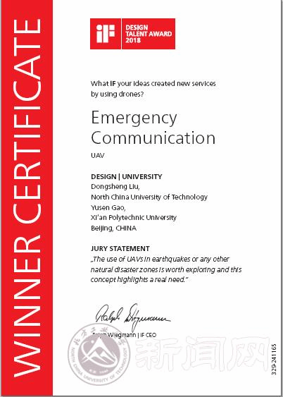 刘东升同学在导师刘永翔教授指导下,认真设计、积极备赛,其参赛作品“Emergency Communication”规划了无人机技术在应急通讯领域创新性的服务设计模式,即利用无人机快速机动的特点,在通讯阻断的受灾区域,快速建立临时应急通讯网络,以促进更加高效、准确、迅捷的救援行动。大赛评委认为,该设计准确把握了抗灾救援的需求,是把无人机技术运用到灾害救援行动中的一个有效探索。该作品将在位于德国汉堡的iF设计博物馆、iF设计奖官方网站和iF设计奖官方APP中进行展出。