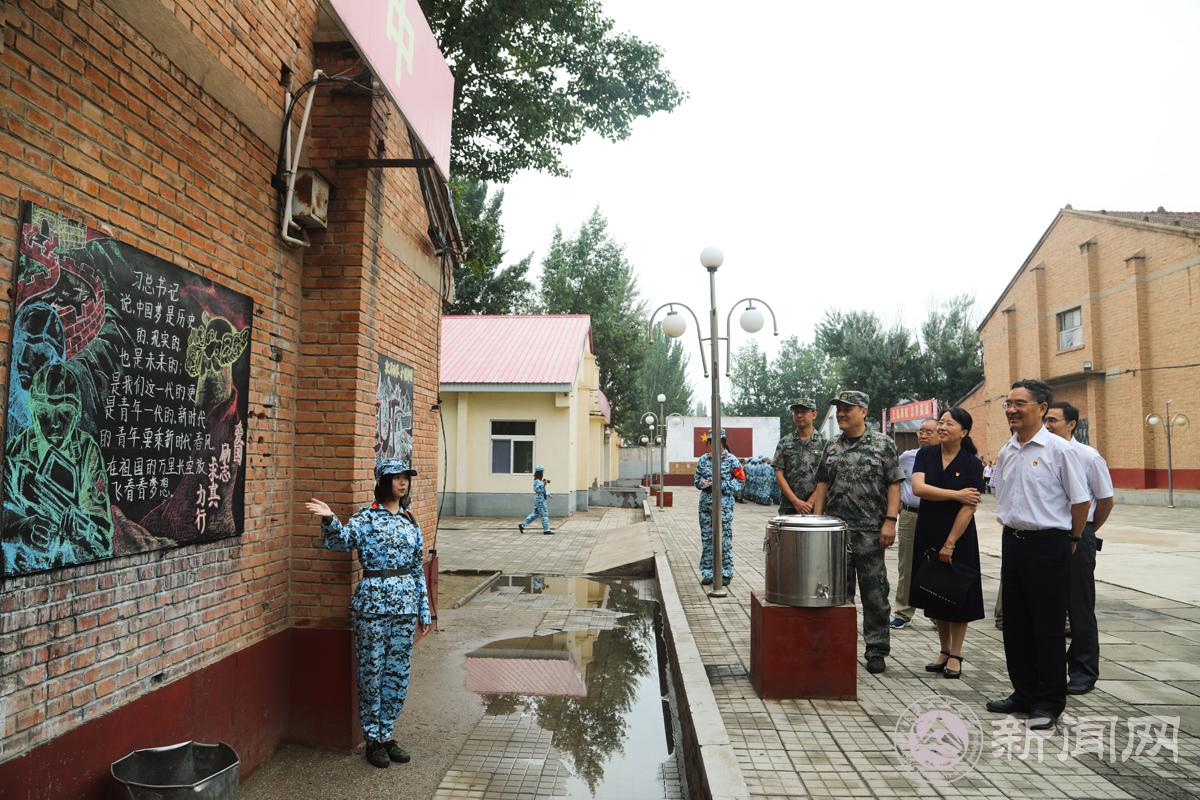 郑书记一行会见了基地及承训部队领导。军训团总协调闫勇、领队赵帅、政委陈卫就同学们入营以来的军事训练、身心状态、学习《学生违纪处分规定》和《学籍管理规定》、宣传和评比等方面情况作了介绍。随后,在军训团成员陪同下,一同观看了同学们的日常训练,参观了各连板报、橱窗展板、营区食堂、宿舍内务、医疗队等。