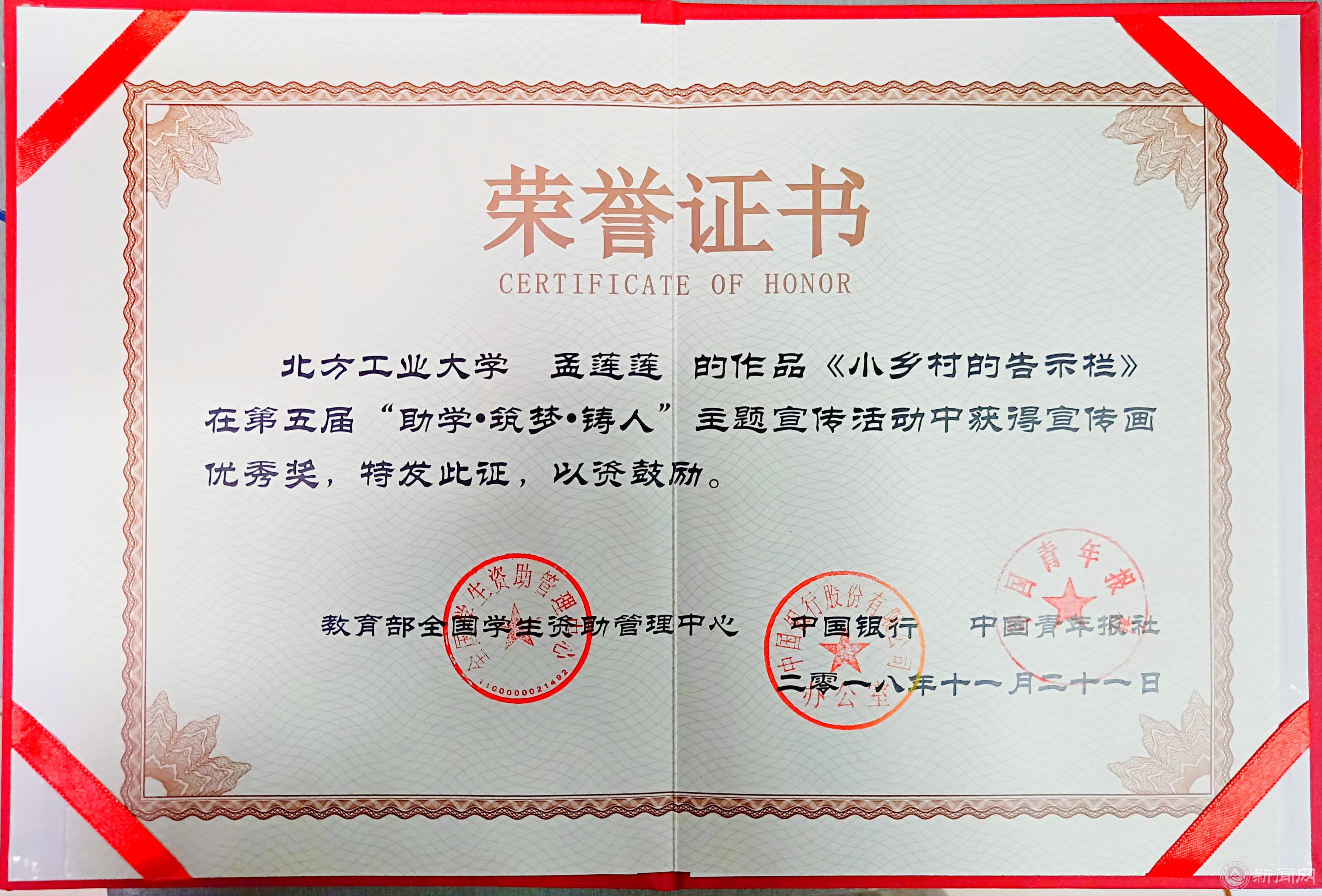 11月21日,第五届“助学•筑梦•铸人”主题宣传活动总结大会在中国农业大学东校区举行,米兰建筑与艺术学院视传17-2班孟莲莲同学的作品“小乡村的告示栏”荣获本次活动宣传画优秀奖。