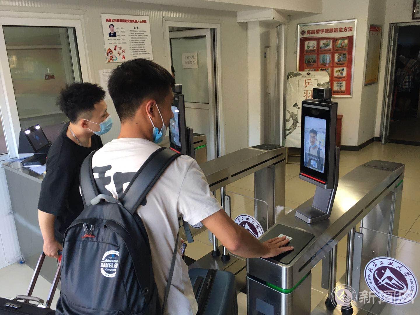 学生通过人脸识别测温系统进入宿舍单元楼