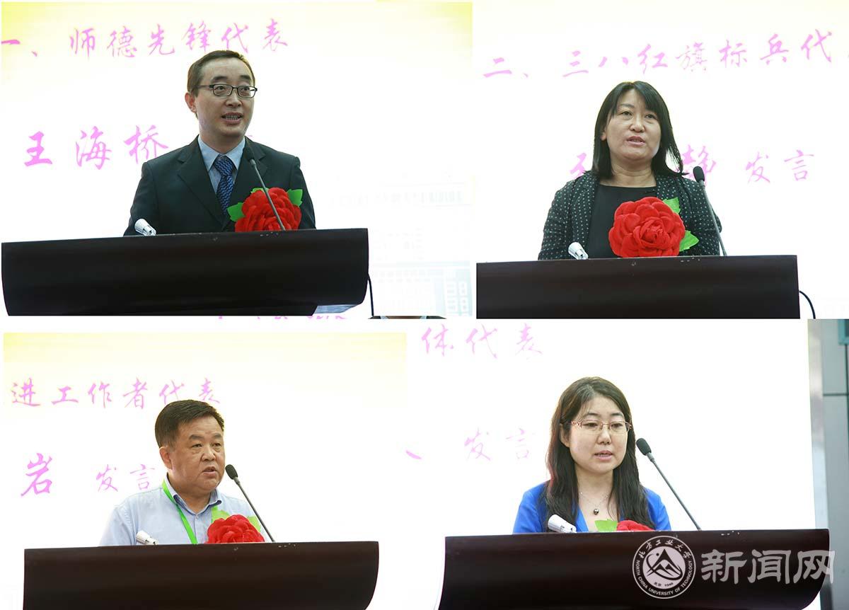师德先锋代表文法学院法律系教师王海桥、“三八”红旗标兵代表信息学院电子工程系教师张静、先进工作者代表机械与材料工程学院材料系教师崔岩、先进集体代表校医院院长马艳春分别发言。代表们表示成绩的获得是奖励更是鞭策,在今后的工作中将继续秉承不忘初心,立德树人的精神,以身示范,培养出更多新时代建设需要的优秀人才,为建设在国内外有重要影响的高水平应用型工业大学而努力奋斗。