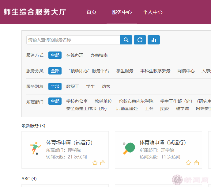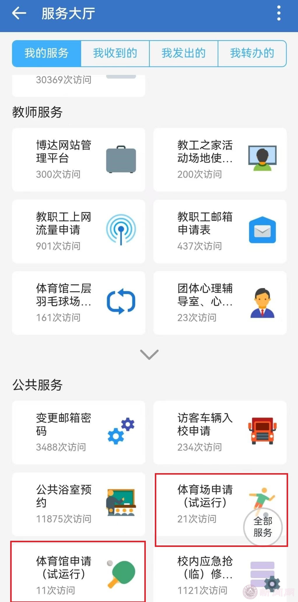 为简化校内体育场馆使用申请流程,提高审批效率,体育场、体育馆线上申请系统现开通试运行。在校教职工可登录校园网或企业微信,在服务大厅公共服务页面进行申请预约。