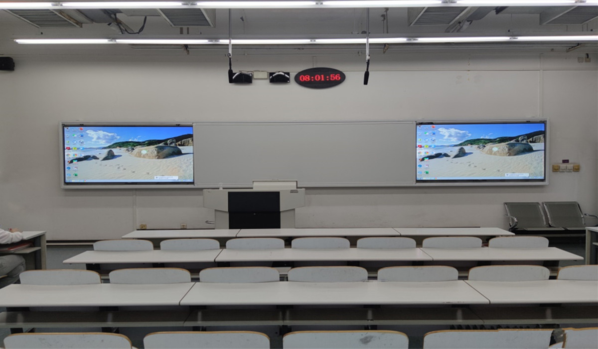 疫情发生以来,教师授课从现场教学向线上线下同步教学转换。网信中心针对教学新模式和师生新需求,在智慧教室、公共教室及博远楼机房的教学信息技术方面勇于创新(图5),利用寒暑假,解决了大规模高并发直播录播授课的各类技术难题,完成教室课程资源录播建设项目,实现了公共教室、机房和会议室同步直播录播,满足了线上线下同步教与学的需求,保证了所有同学都能获得优质的听课质量,让每一个学生不因疫情而耽误学习,为兄弟院校返校复学提供了经验。此外,今年暑期完成浩学楼东全部12间阶梯大教室(图6)和励学楼220、211,瀚学楼103小教室样板间(图7)的多媒体设备改造工作,根据各教室的不同大小和布局,大教室采用多屏显示、蓝牙麦克扩音等方式,提升教学技术手段和环境条件,力求课件呈现无死角、声音传输无盲区;试点多功能白板、无感知考勤、无线投屏等便捷教学手段;试点小教室不同形式样板间建设,拟通过征求师生本学期的使用反馈意见,为明年全部小教室多媒体改造提供参考经验,脚踏实地推动教育教学与信息化技术深度融合。