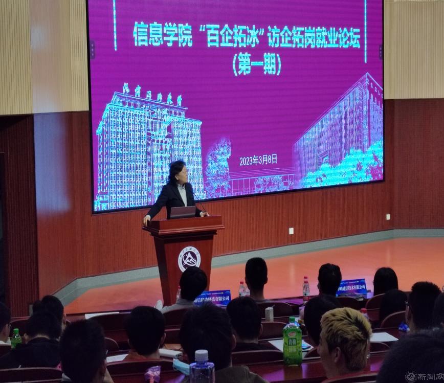 3月8日上午,信息学院在文化会堂组织开展了第一期“百企拓冰”访企拓岗促就业论坛活动。北京七一八友晟电子有限公司、北京凌华峰通信技术有限公司、北京亿和影视制作公司等6家企业的招聘负责人受邀到校进行现场交流,校党委常委、副校长栗苹,招生就业处处长董慧凝,信息学院院长马礼、副书记陈卫、辅导员和毕业班导师出席活动,学院2023届毕业生200余人参加了本次论坛。