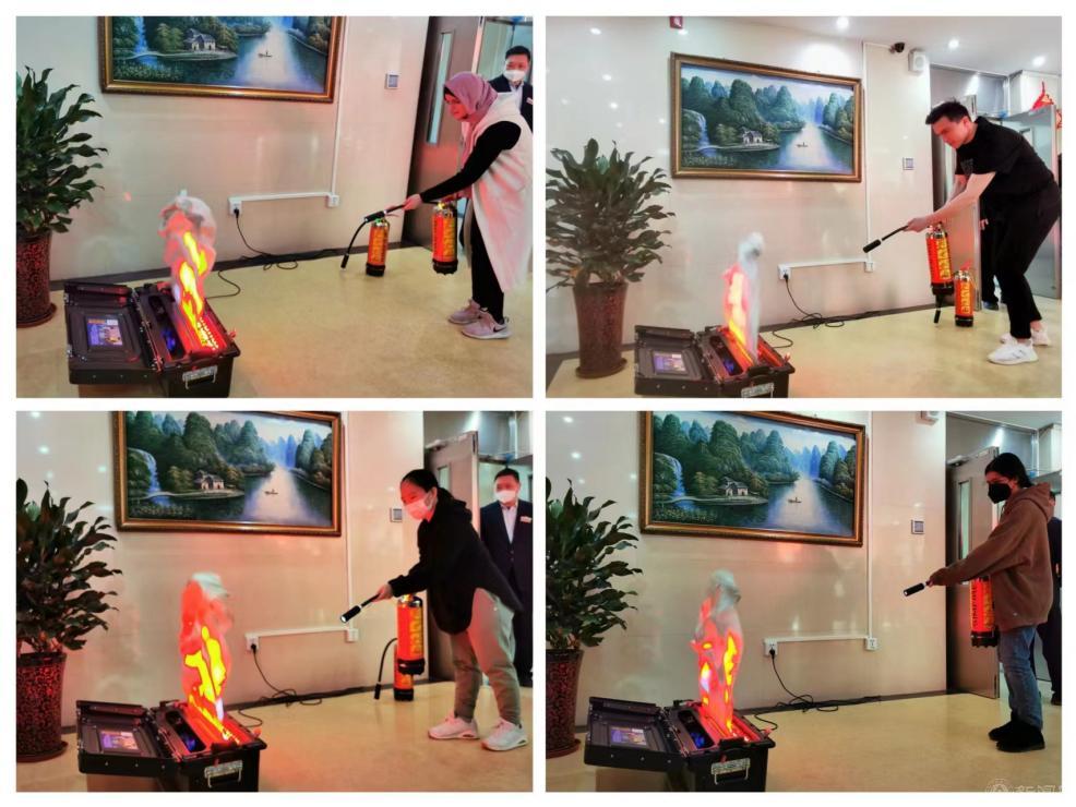 校安稳部朱刚老师结合留学生公寓特点,向大家重点讲解了宿舍楼发生火灾时如何自救逃生,如何正确使用灭火器等消防安全知识。随后,留学生和部门员工亲身体验了使用模拟灭火器扑救初期火情。