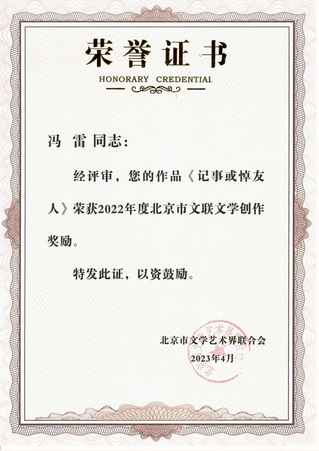 日前,北京市文学艺术联合会在老舍剧场举办“2022年北京市文联文学创作奖励颁奖典礼”。米兰文法学院冯雷副教授凭借文学作品《记事或悼友人》获得奖励,作品发表在《北京文学》2022年第3期。