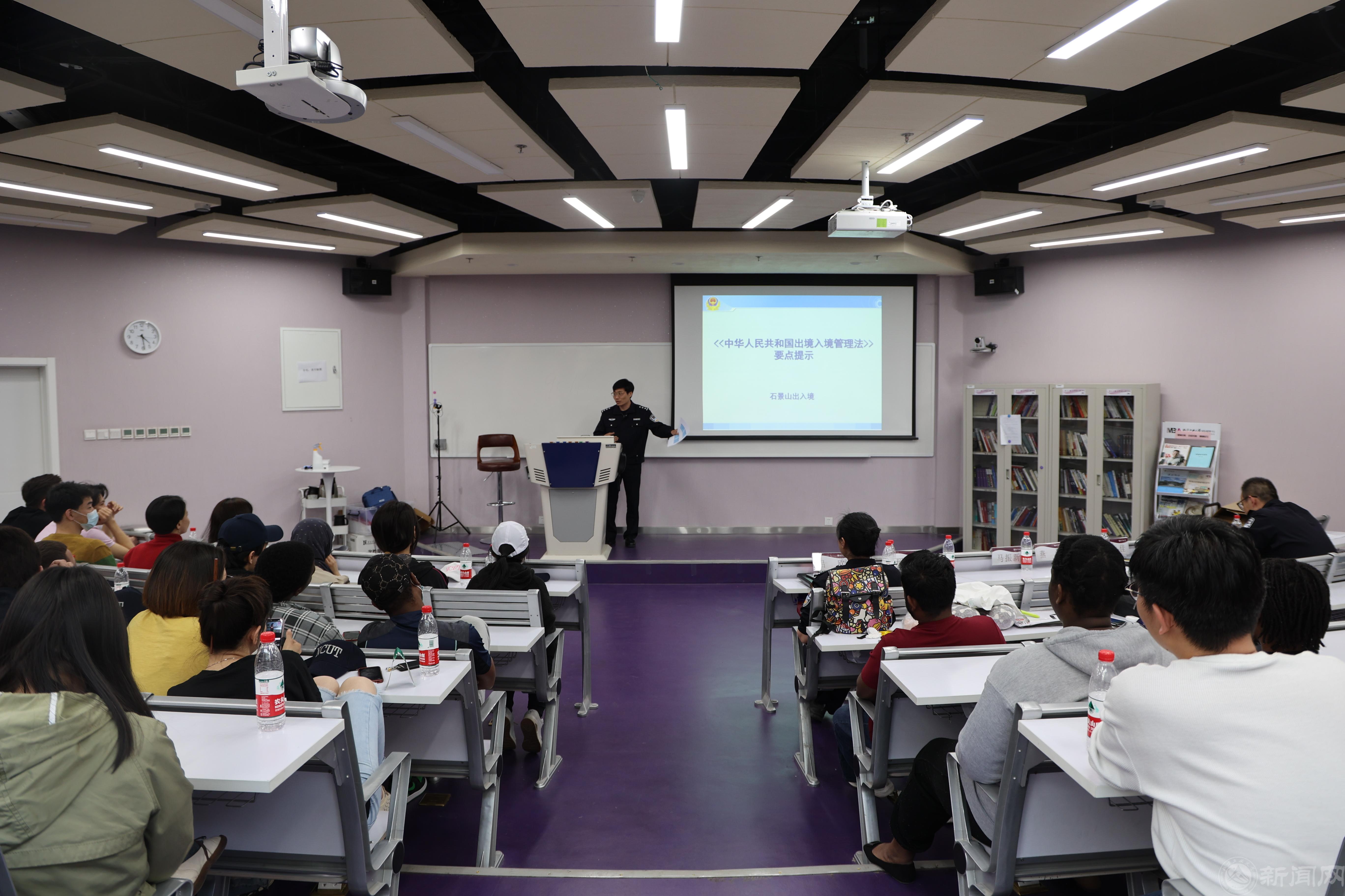 国际学生法律法规宣传教育专题讲座在国际学院103教室召开,由副院长徐美主持。石景山分局出入境警官以宣传《中华人民共和国外国人入境出境管理法》《中华人民共和国外国人入境出境管理法实施细则》《中华人民共和国治安管理处罚法》等法律法规为重点,分别从防范诈骗、禁毒知识、签证政策、国际学生在华注意事项等四个方面进行了详细生动地讲解,受到国际学生们的一致好评。在互动问答环节,出入境警官还就国际学生提出的实习实践、勤工助学、证件办理等问题逐一进行解答,现场气氛热烈。