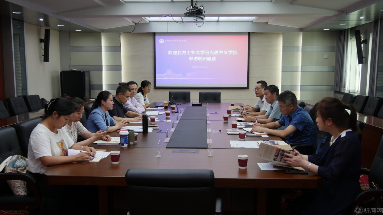 为深入开展学习贯彻习近平新时代中国特色社会主义思想主题教育,将调查研究做深做实,切实增进思政课改革创新实效,加快推进北京市重点马院建设,近日,由学院党委书记张茂林、院长袁本文带队,学院班子成员与教研室主任代表赴北京科技大学马克思主义学院进行调研。北京科技大学马克思主义学院院长宋伟,副院长杨兴业、安静、李萌以及教研室相关负责老师参加调研活动。