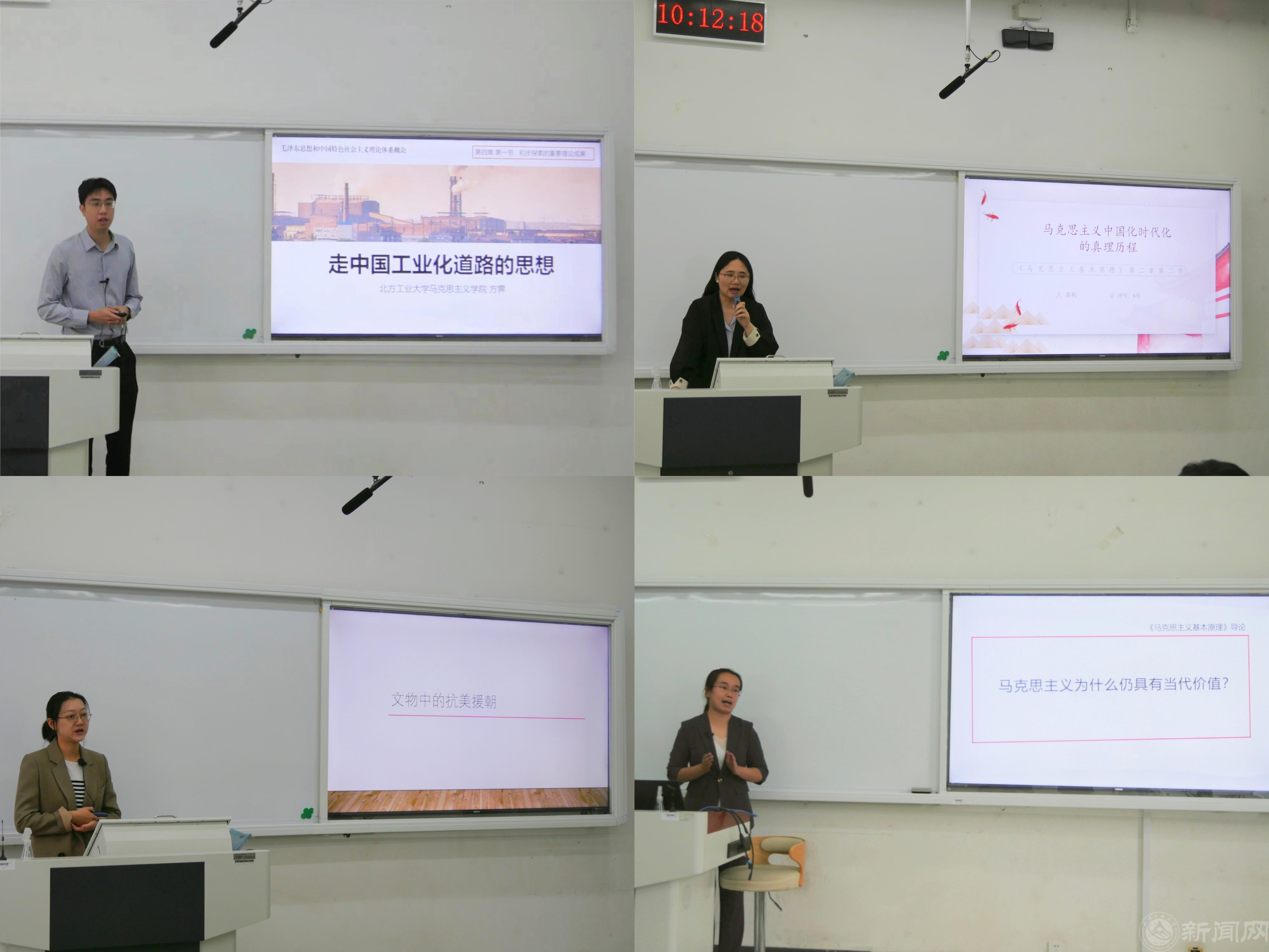 本次比赛特邀首都师范大学、北京建筑大学、北京信息科技大学的同行专家,以及马克思主义学院教授袁本文、学校思政课教学督导员王包泉共同担任评委。共有8位青年教师分别围绕“习近平新时代中国特色社会主义思想概论”“思想道德与法治”“中国近现代史纲要”“马克思主义基本原理”“毛泽东思想和中国特色社会主义理论体系概论”等课程内容,结合教学的重难点与学生关切,进行了精彩的教学展示。