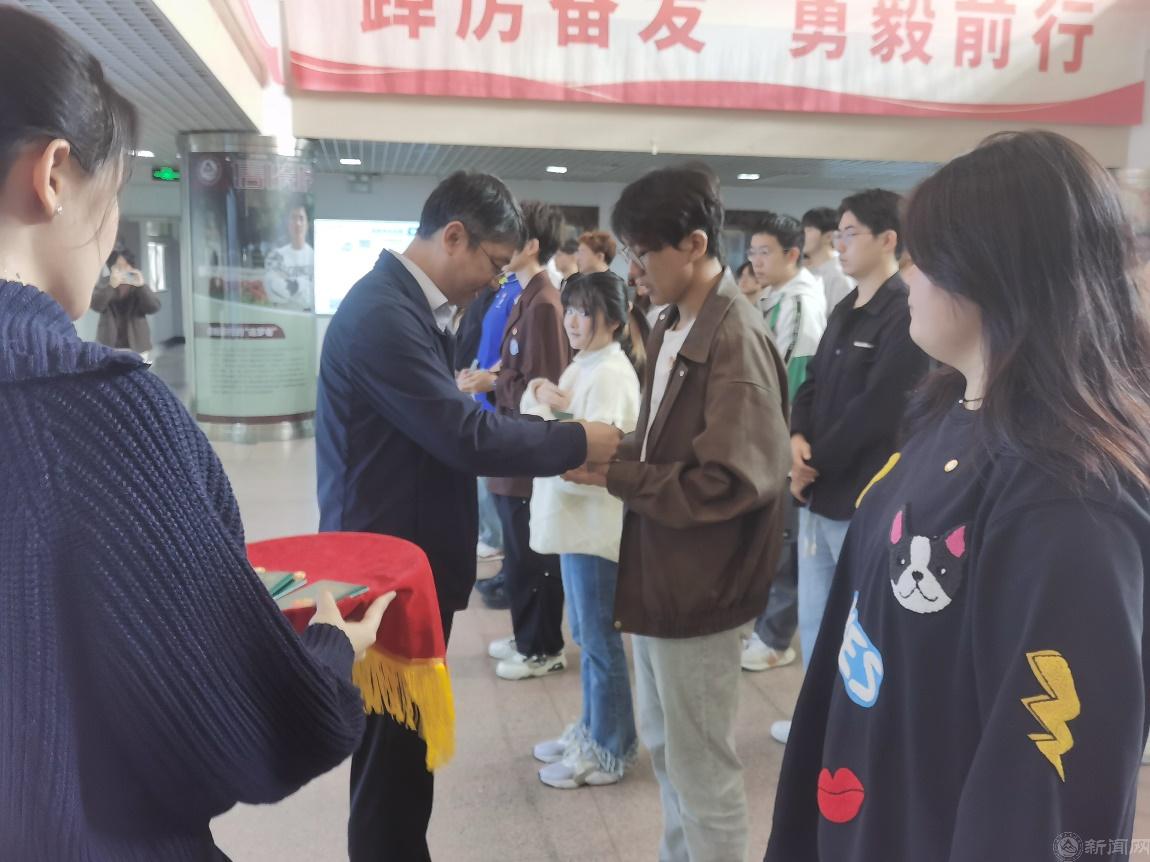 学院党委副书记陈卫老师为新团员代表佩戴团徽,颁发团员证。祝贺新团员加入共青团大家庭,开启人生新篇章。老师的期许与嘱托都凝聚在这一枚红色闪耀的团徽上,这一刻,历史的接力棒已传到这一群新生力量当中,这不仅是一份荣誉,更是一份责任与担当。