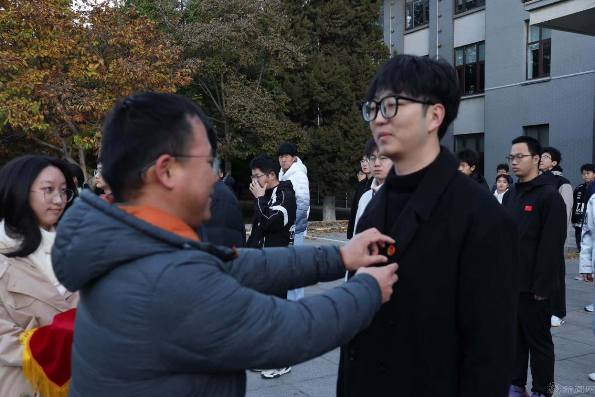 升旗仪式后,学院团委书记杨和家老师为新团员代表佩戴了象征荣誉与责任的团徽,祝贺新团员加入共青团大家庭,开启人生新篇章。老师的期许与嘱托都凝聚在这一枚红色闪耀的团徽上,这一刻,历史的接力棒已传到这一群新生力量当中,这不仅是一份荣誉,更是一份责任与担当。