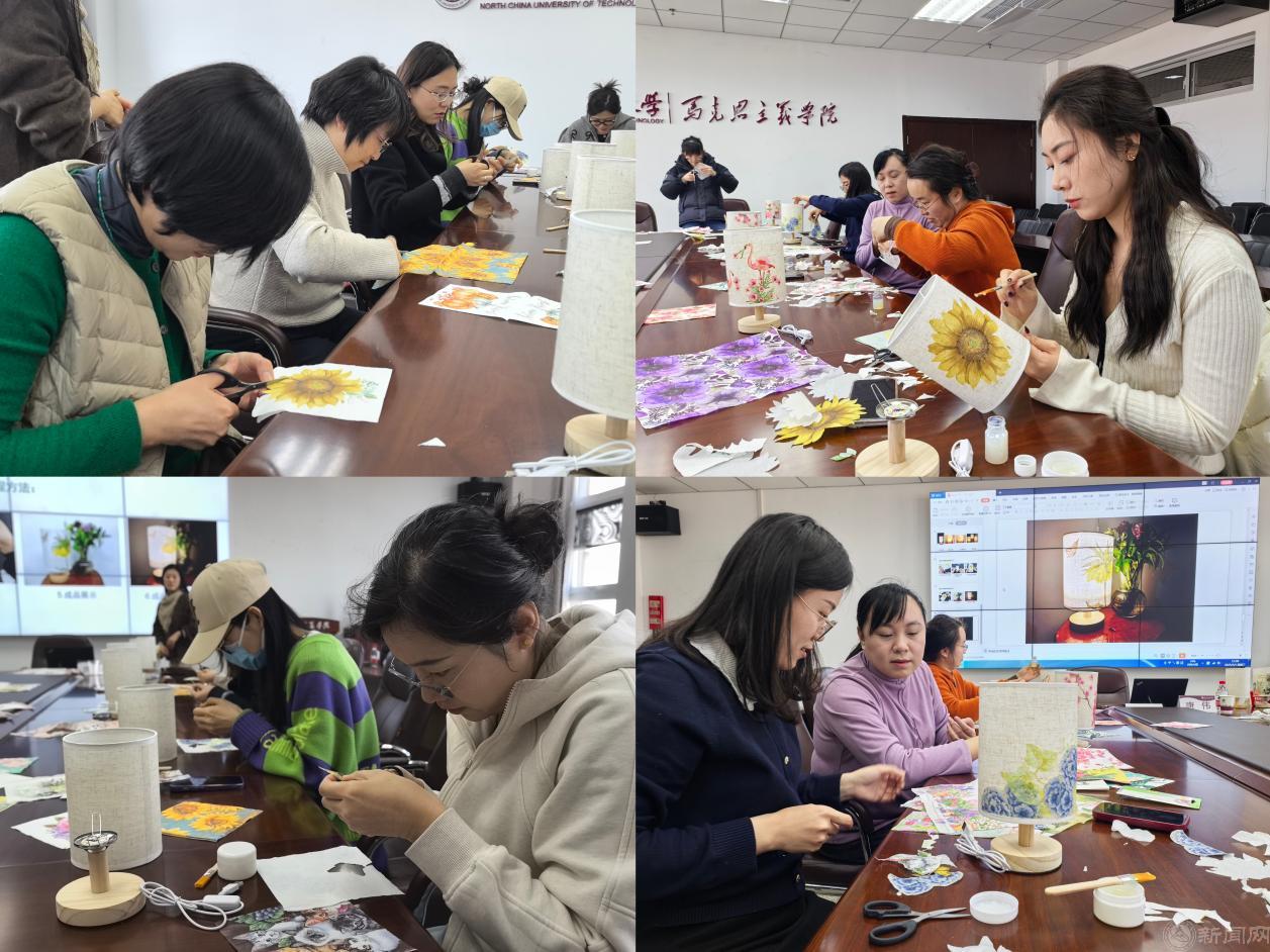 活动邀请石景山区教育协会艺术教育分会理事、石景山区面塑非遗传承人唐伟进行现场指导。唐伟详细介绍了蝶古巴特的历史渊源与文化内涵,并逐步演示蝶古巴特台灯的制作步骤。蝶古巴特源于法语“Decoupage”,意为将美丽图型剪裁,拼贴装饰于家饰物品或家具上,展现出创意与艺术的装饰工艺。
