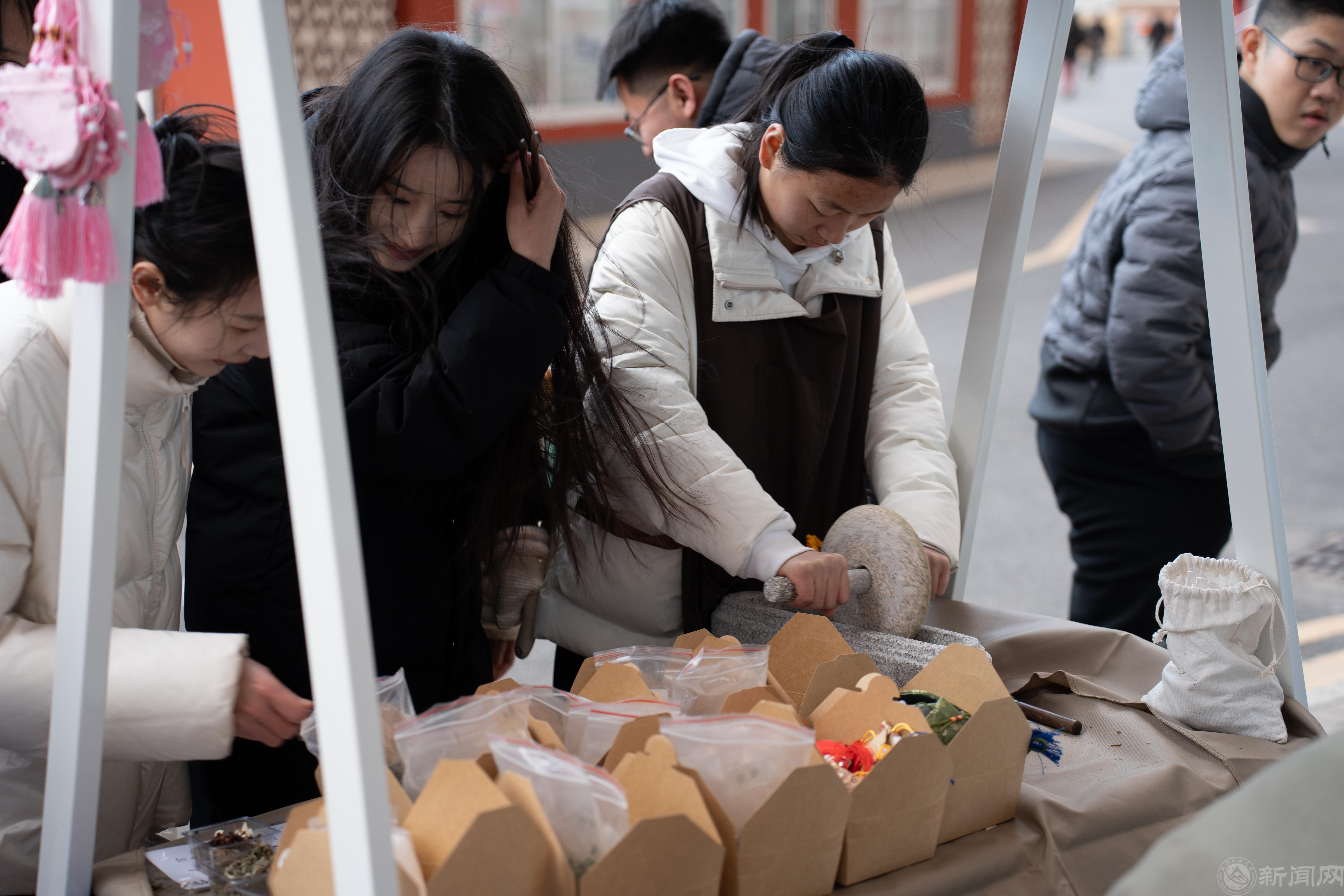 书香文化展区呈现活力图景。活动现场设置20个主题展位,划分为图书交流、文创展销和非遗体验三大功能区。图书展区汇集文学、历史、科普等类别书籍,其中非遗类书籍备受关注。文创展区陈列的扎染布艺、掐丝珐琅书签等百余件作品,将传统工艺与现代审美有机融合。非遗手作体验成最大亮点。在非遗传承人指导下,学生现场参与漆扇绘制、古法香囊制作等传统技艺实践。材料处理环节中,师生们仔细研磨艾叶、藿香等药材,体验中药配伍的匠心。“通过亲手制作漆扇,不仅理解了‘大漆如人生’的工匠精神,更感受到传统工艺的温度。”建筑与艺术学院杨未豪同学展示着自制的漆扇说道。